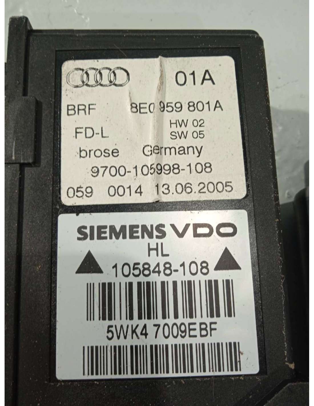 ELEVALUNAS TRASERO IZQUIERDO RECICLADO DE AUDI A4 AVANT (8E) 2.0 TDI. Identificador 770015. Familia: CARROCERÍA LATERALES. Referencia: 8E0959801A